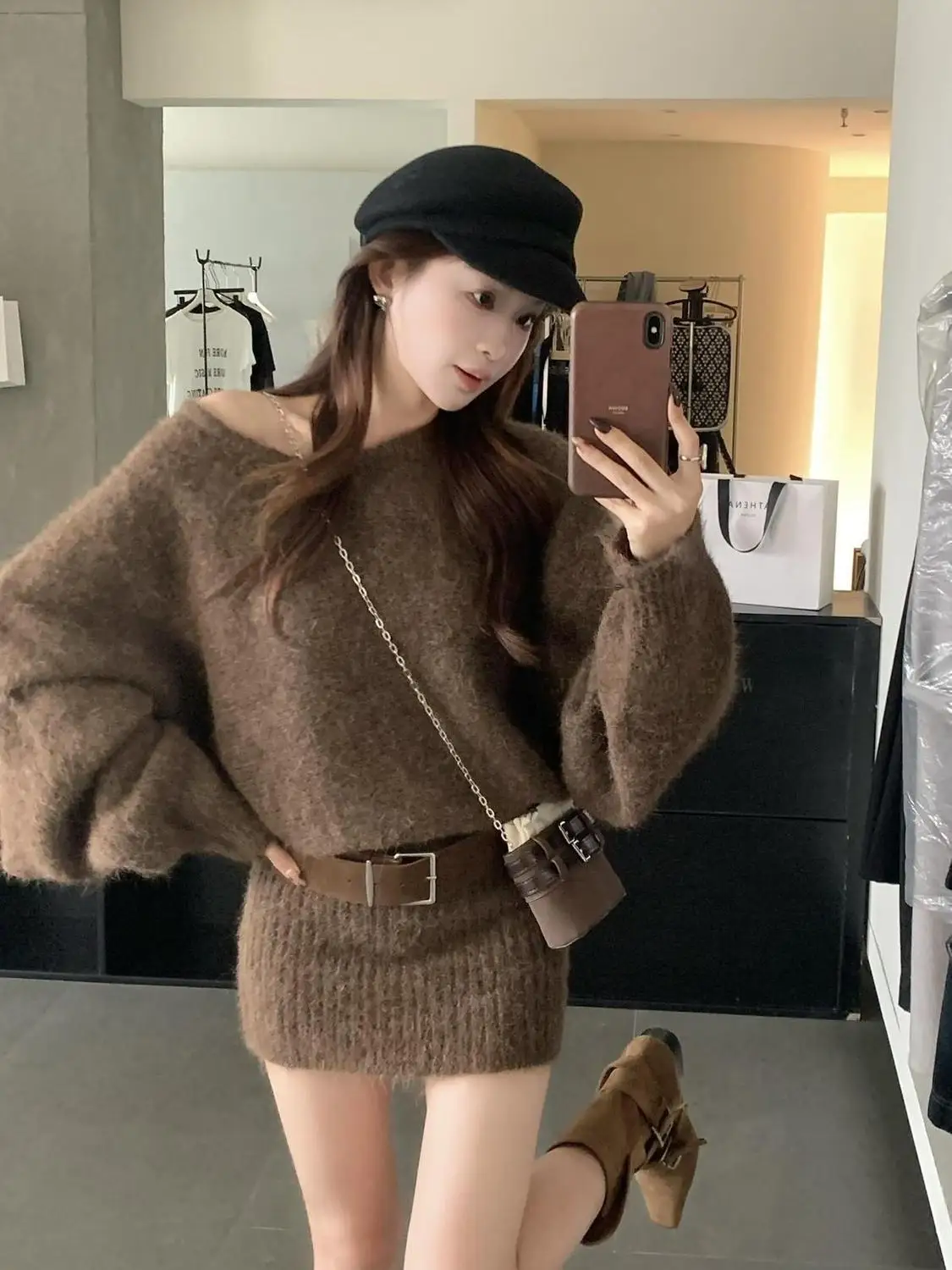 Femmes tricot pull pull manches chauve-souris Sexy longs tricots hanche jupe pull avec ceintures Vintage automne hiver tricoté pulls